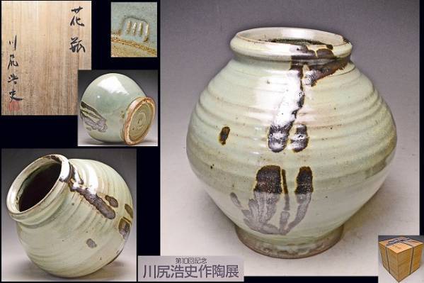 - 川尻浩史 ★ 益子焼 ★ 青釉鉄絵壺 ★ 共箱栞個展DM ★ 検 窯師 柿釉 灰釉 ★