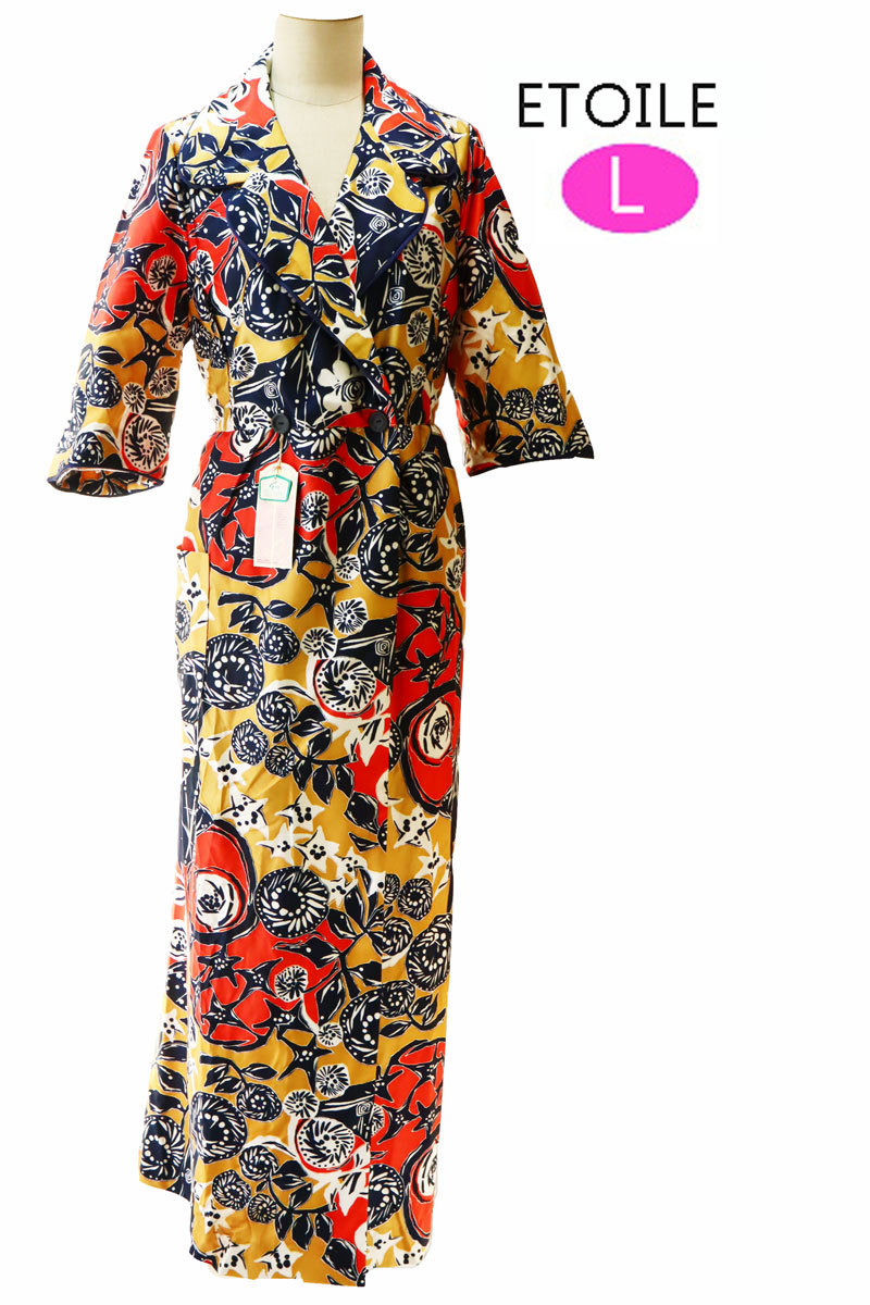 > r4040 昭和のガウン 紺×金×オレンジ 草木 ボタニカル柄 着丈120cm 日本製 エトワール 新古品 未使用 値段付き