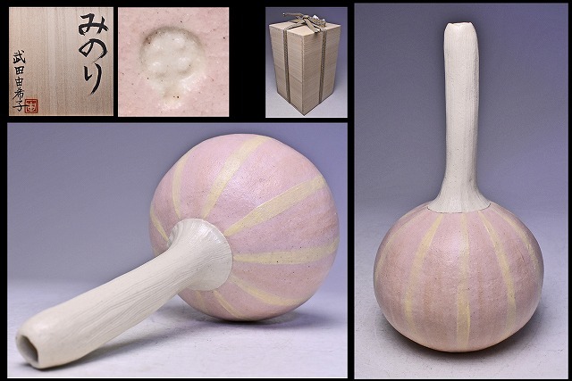 > 武田由希子 ★ 色絵鶴首壺 ★ 銘: みのり ★ 共箱 ★ 女性らしい優しい色使いが美しい逸品 ★ 華道具 ★