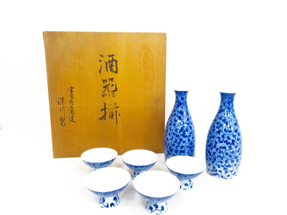 > 未使用品・レトロな逸品!◆深川製磁 宮内庁御用達 酒器セット 美術有田焼 徳利 お猪口 7点セット 管理2002 N-7