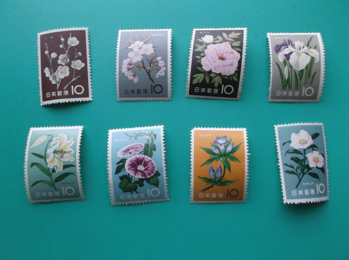 - 未使用 昔の切手 花シリーズ 1961年発行 単片8種 b うめ さくら ぼたん しょうぶ やまゆり あさがお りんどう さざんか