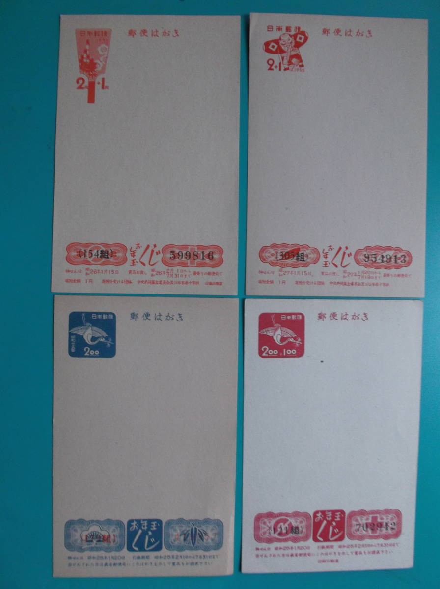 - 官製葉書 4枚組 昭和25年用年賀 松くい鶴(赤青2枚) 昭和26年用年賀 羽子板 昭和27年用年賀 奴凧