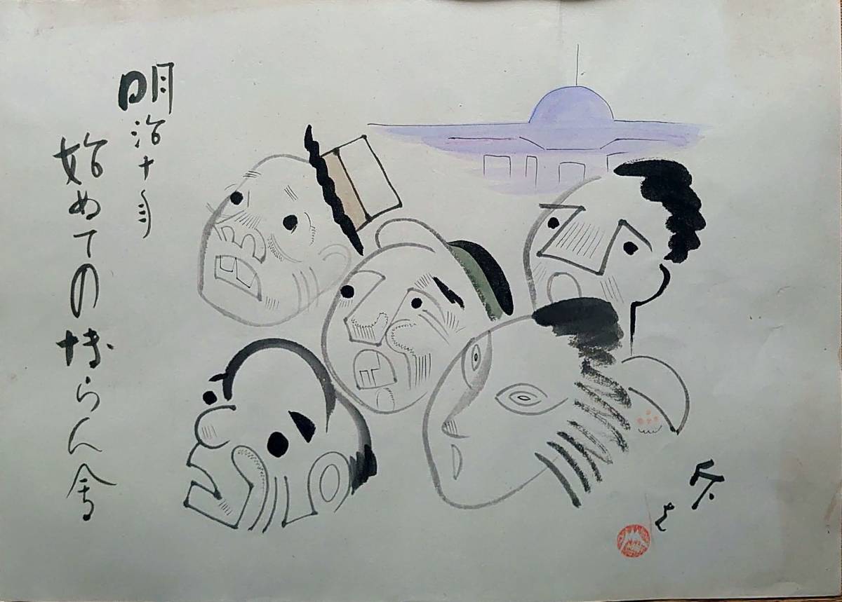 - f20071404〇肉筆漫画 色彩手書き 開国六十年史図絵 No.9 初めて博覧会開催 藤本斥夫 昭和2年 中央美術協会〇和本古書古文書