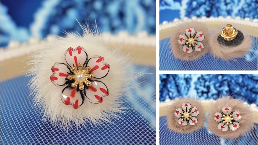 - 【プラ板花&ミンクファータックピンブローチ/4点】送料無料/ハンドメイドアクセサリー