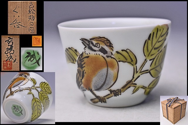 > 高橋誠 ★ 色絵頬白図ぐい呑 ★ 共箱 共布 ★ 師:人間国宝 藤本能道 ★ 酒器 ★ ホオジロ ★