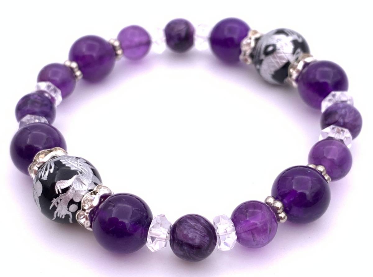 - 天然石オニキス銀彫り青龍&アメジスト&チャロアイトのブレスレット