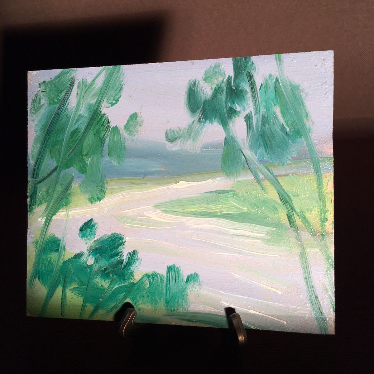 - 手書き油絵 印象画 深緑と小川 インテリア 置物 絵画