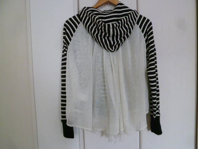 - Clean2○黒×白ボーダー後ろシフォンレース異素材ドッキングパーカー40/ジップアップブラックホワイト○P1029①