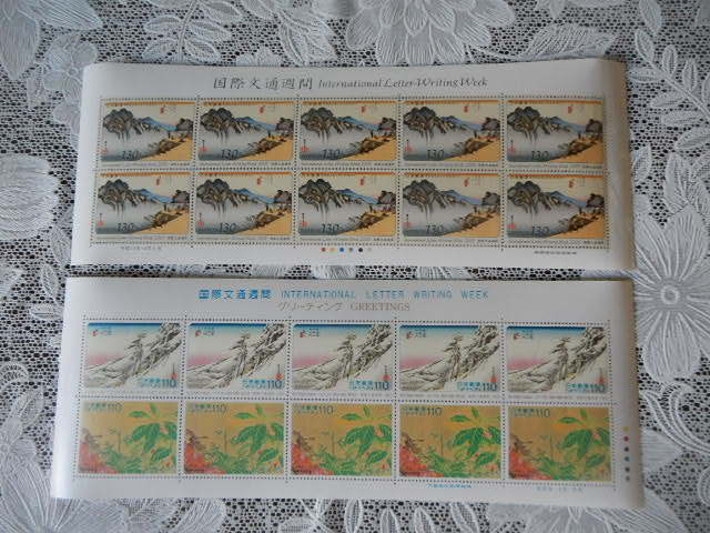 - 額面 2400円 未使用 切手 2シート 110円×10枚 130円×10枚 歌川 広重 東海道五十三次 亀山 坂之下 まとめて セット 国際文通 コレクション