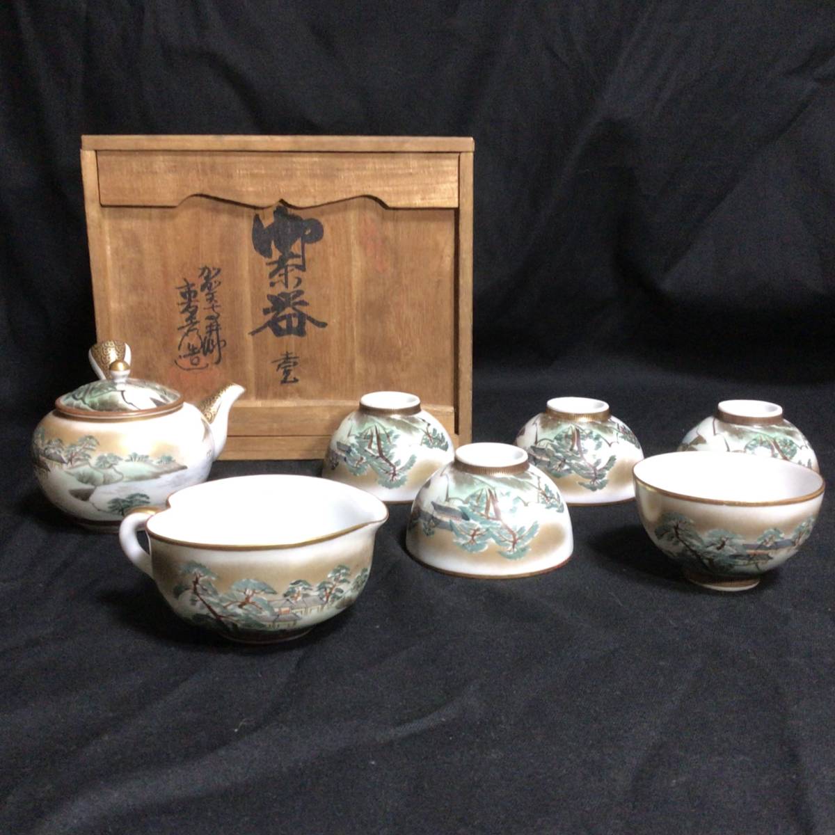- 初だし 古い九谷煎茶器揃い 7点セット 海岸の松林の図