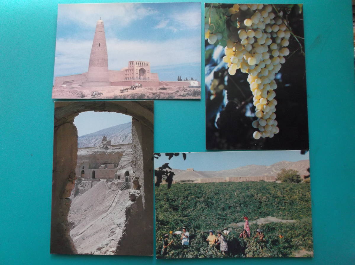 - 昔の絵葉書 9枚組袋付 中国大陸 吐魯番(トルファン)文化館 額敏塔 白葡萄 千仏洞 葡萄園 摘葡萄 炊兒井 火焔山 葡萄架 交河故城