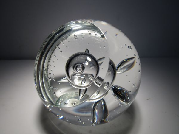 Crystal Clear (水晶のように澄み切った)という名の作品。斜め1面をカッティングされた、作品名の通りのクリアガラスに大小、形違いの、コントロールバブル技法による気泡で表現された造形に凛とした美しさの感じられる良品です。中央の花弁、周りの細かな気泡、クリアガラスながら奥行きのあるよくできた作品です。見る角度で様々な表情を見せてくれるのも魅力の1つだと思います。