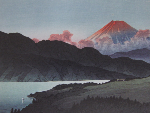 - 川瀬巴水、【芦の湖夕富士】、希少な額装用画集より、美品、新品額装付、送料込み