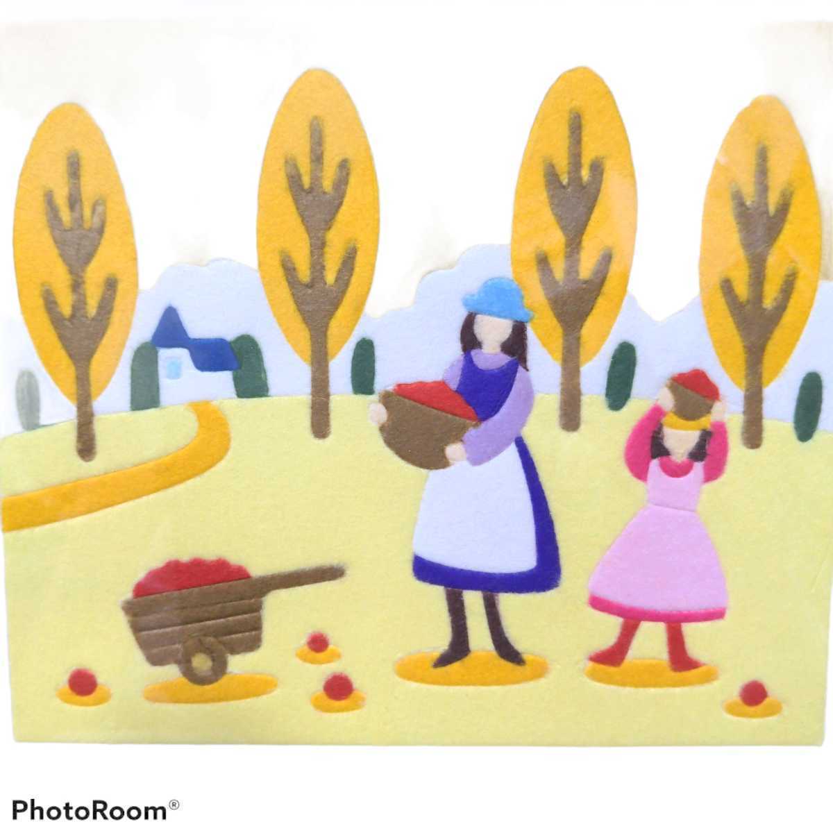 - 絵 絵画 アート 額縁 りんご リンゴ 収穫 木製フレーム ナチュラル 親子 秋 縦26cm×29.5cm イエロー カーキ 癒し 幸せ 豊か