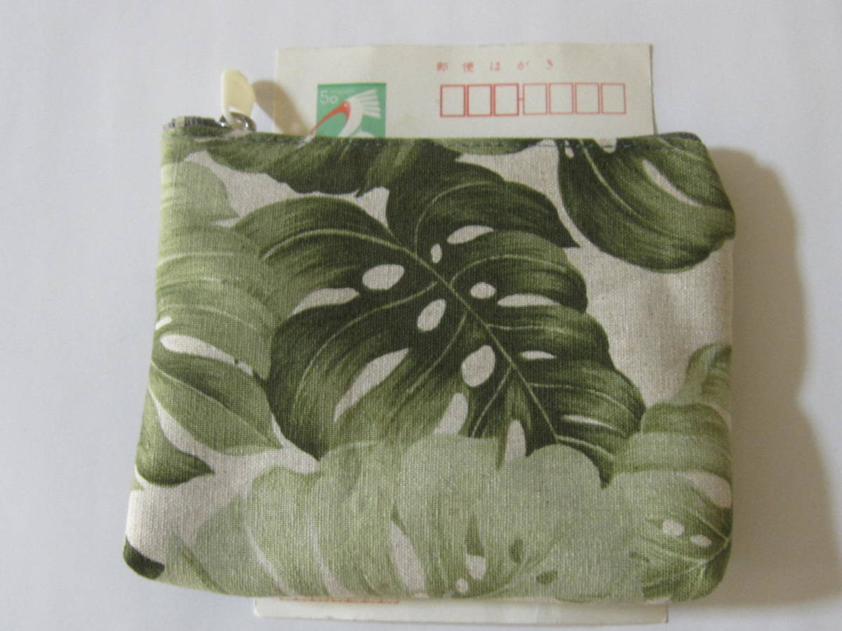 - 手作り 小物 ポーチ ハワイアン柄 モンステラ 葉っぱ 模様 リーフ 葉 リネン ハンドメイド 充電器 財布 男女 兼用 格安 可愛い 植物 綿麻