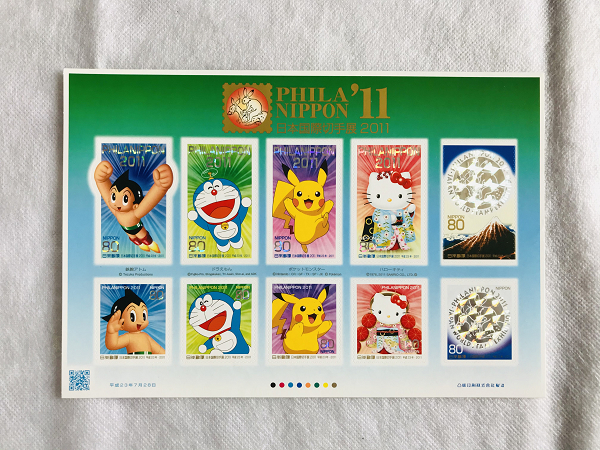 - 未使用 切手シール 日本国際切手展2011 80円シート額面800円/PHILA NIPPON'11/鉄腕アトム/ドラえもん/ピカチュウ/キティ/富士山/うさぎ/①8