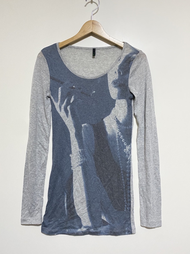- ▼ BENETON. 長袖 カットソー ニットソー ビッグプリント 海外女性 パイプ タバコふかし グレー 薄手 トップス
