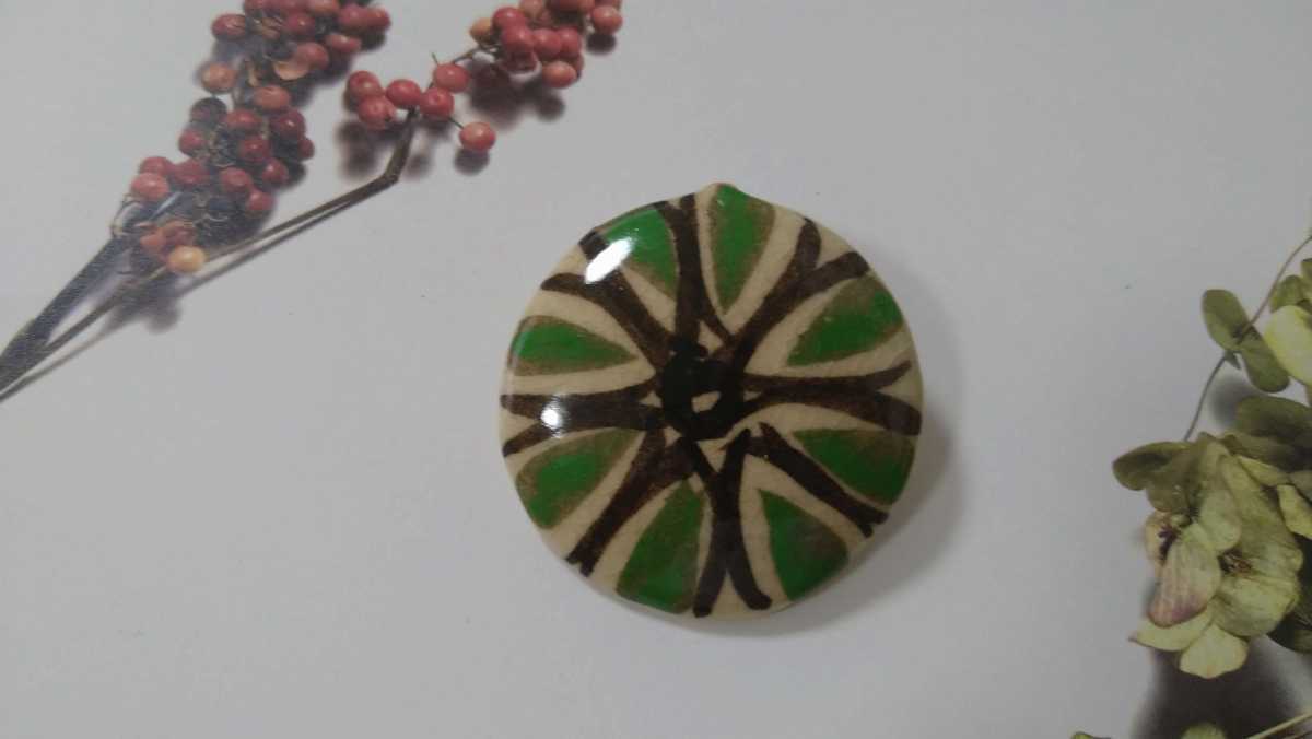 - □ベージュ×緑・模様入り 丸い陶器のペンダントトップ□
