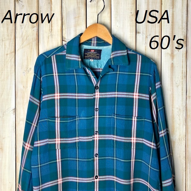 > USA古着 60s ARROW チェック柄 レーヨンギャバシャツ M~L 青緑 オールド ヴィンテージ アメリカ古着 アロー ギャバジン 開襟襟 ●153