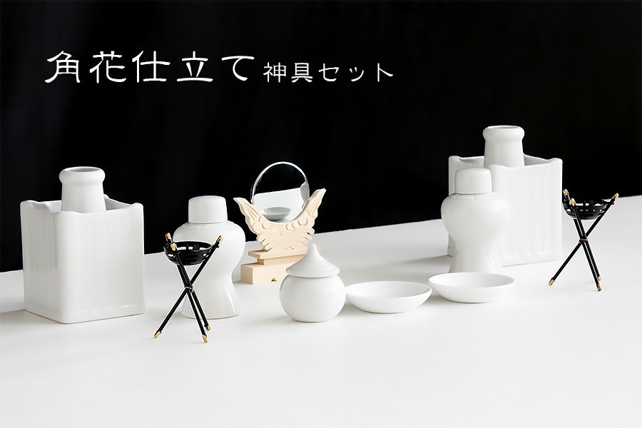 - 神具セット 10品目 ■ 角花仕立て ■ 神鏡・かがり火付 中・大型 神棚 祖霊舎 に最適 土器セット