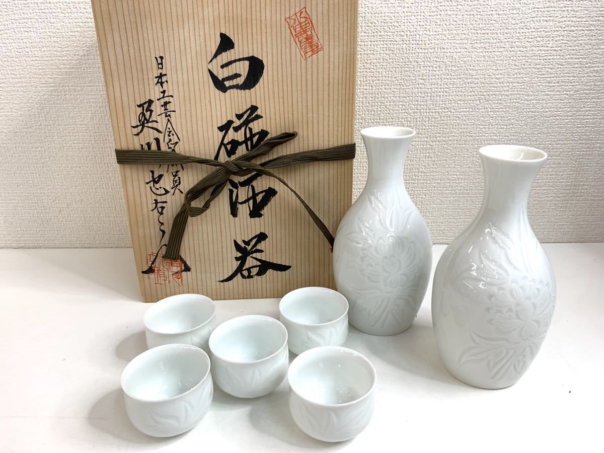 > 未使用品▲有田焼 二代 奥川忠右衛門 白磁 酒器 草花紋 銘あり 木箱入 その1 管理2109 H-12