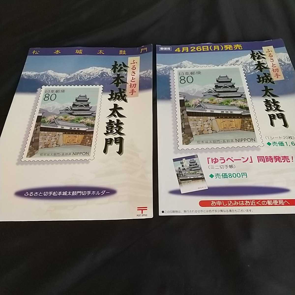 - ふるさと切手松本城太鼓門、切手ホルダー、発行案内、チラシ、