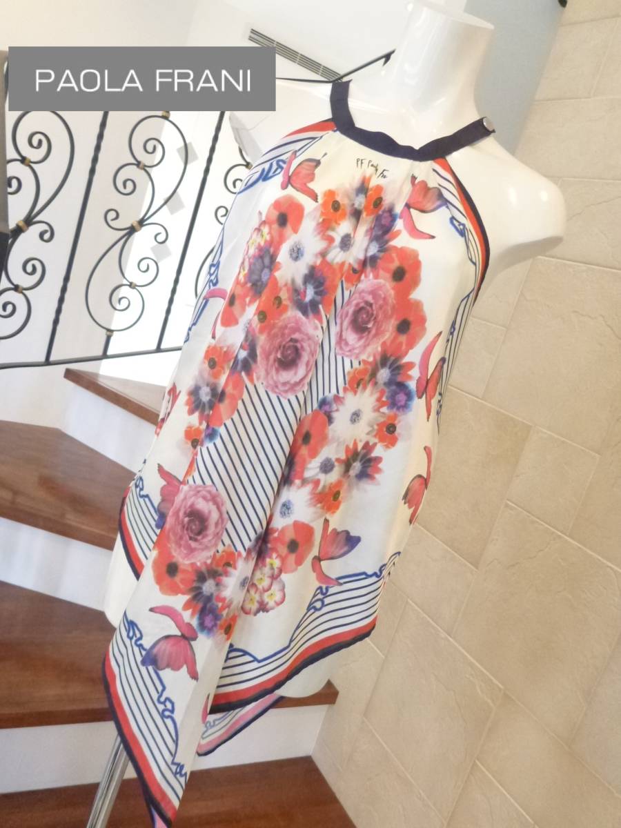 - 美品 PAOLA FRANI パオラフラーニ ★濃紺 赤 白 花柄 ノースリーブシャツ デザインシャツ S相当
