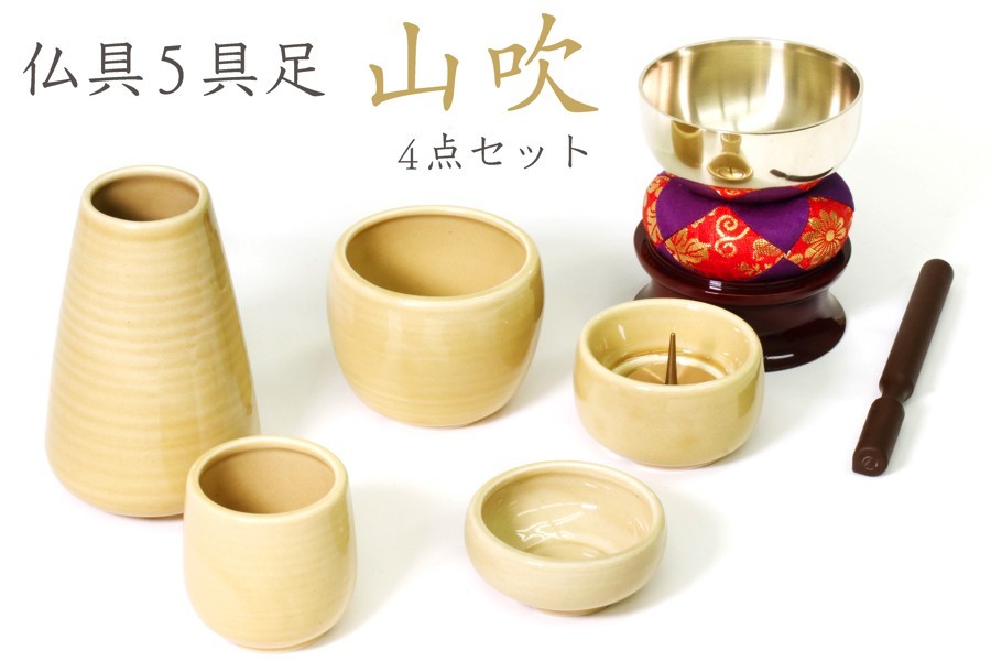 - 国産 仏具 仏具セット ■ 和柄 5点セット 山吹 + おりん4点 ■ モダン 家具調 仏壇 お供え ■ 香炉灰付 お盆 お彼岸 お墓参り 供養