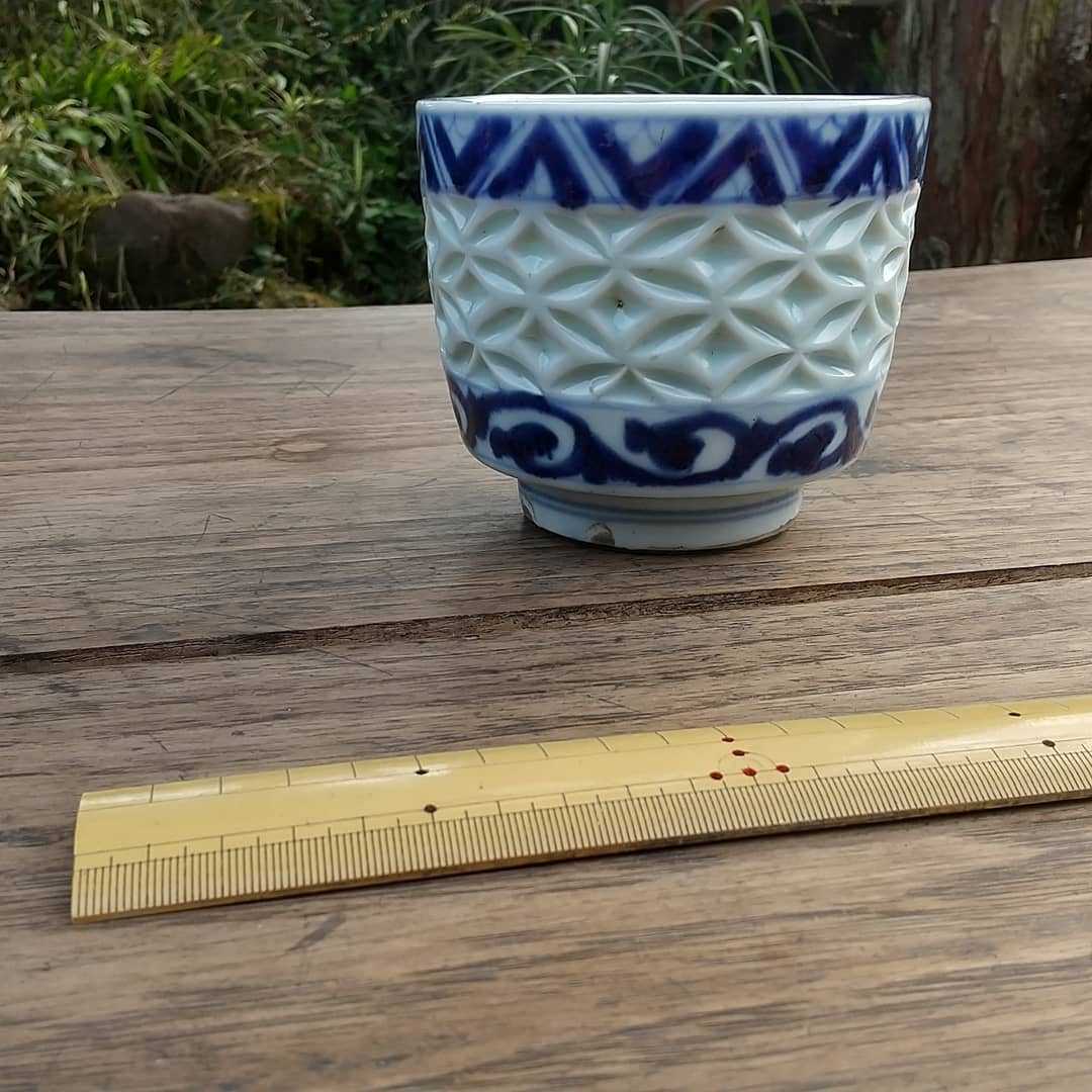 - 江戸期 古陶磁器 青磁釉七宝陽刻染付 火入灰受け 【直径11.5㌢高さ10㌢重さ550㌘】