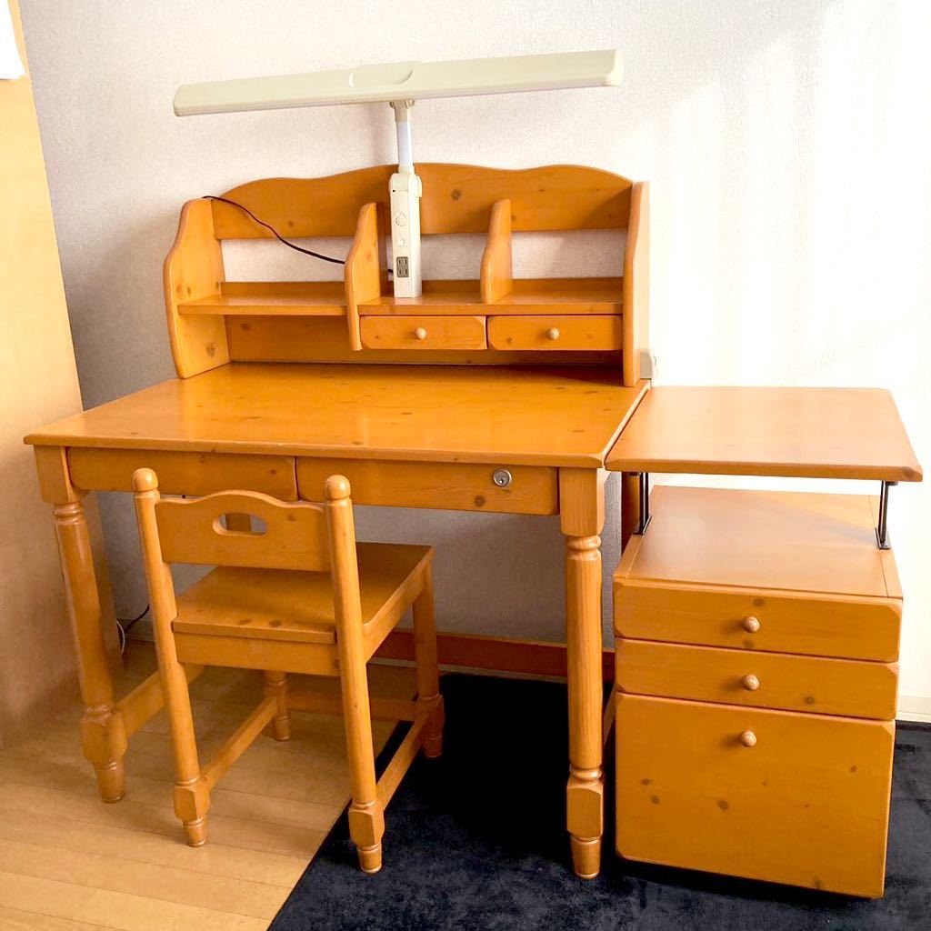 - b18)学習デスク ワゴン付 勉強机 照明付 デスク ライト付 宮付き 天然木 机 子供用 学習机 木製 学習椅子 イス デスクセット パイン材