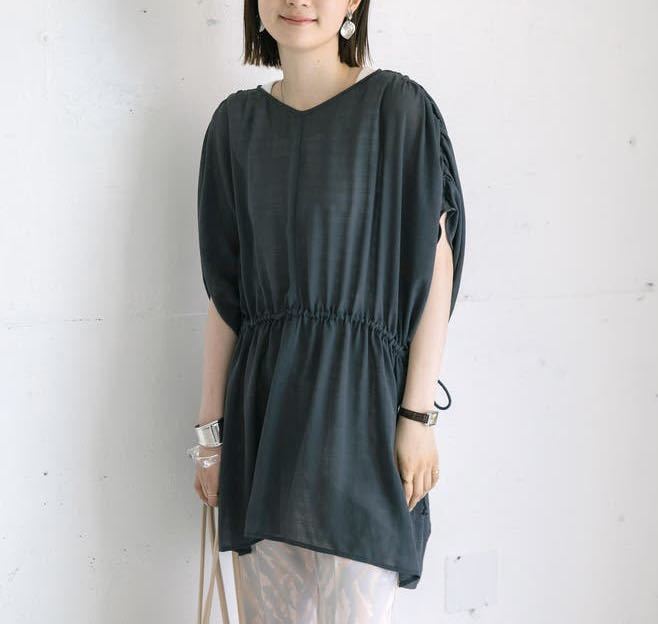 - coen シャドーチェックギャザーブラウス ダークグレイ
