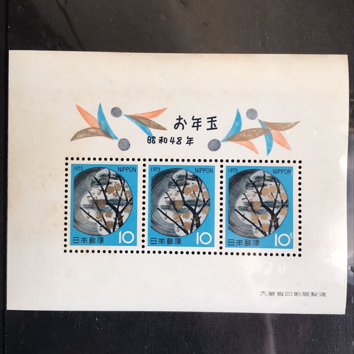 > 年賀切手「昭和48年 お年玉切手 小型シート 1枚」10円×3★1973年発行・長期保管品