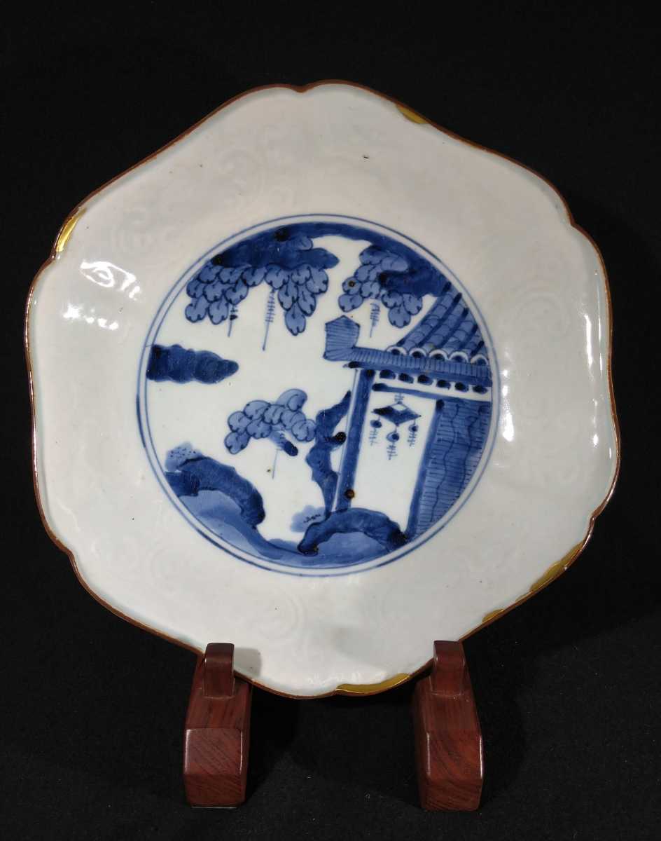 > 藍九谷 後期 陽刻 染付 葡萄文 大明成化年製 28cm 六角 変形 大皿 a-大5b1346