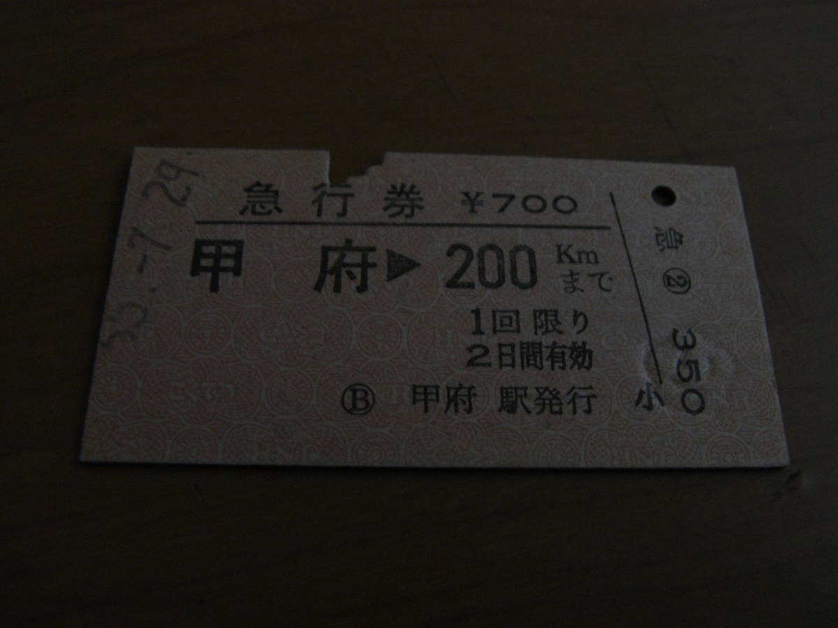 - 急行券 甲府→200㎞まで 昭和55年7月29日 甲府駅発行