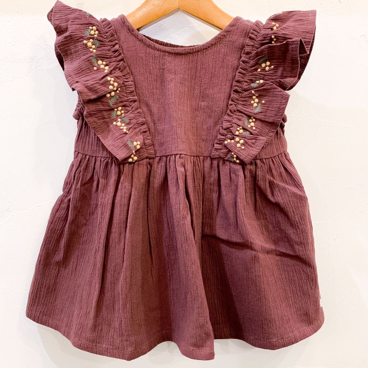 - 【新品 coto cotte コトコト 100㎝ ワンピース チュニック 刺繍 ブラウン 花 ミモザ フリル かわいい サマードレス