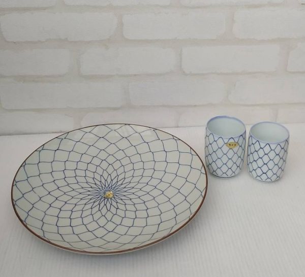 > 14N1.20-21 未使用 有田焼 肥前焼 萬泉作 網目皿 大皿 + 西陶作 湯呑 2個 まとめて