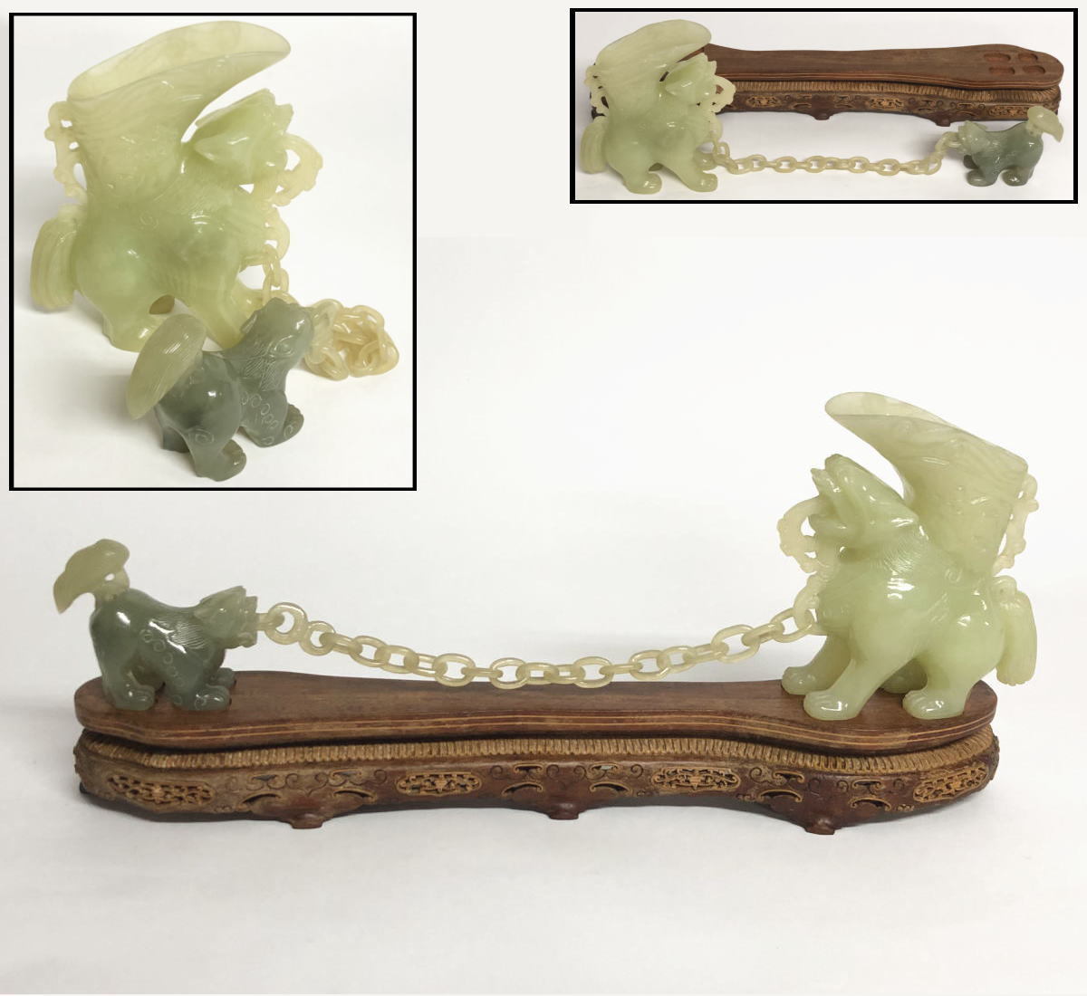 - 【送料無料】天然青白和田玉約830g 貔貅親子同心手彫り 一つ玉石一刀彫 黄楊(柘植)台付 無着色 縁起一点もの 骨董 (旧家蔵出し) WWFT074