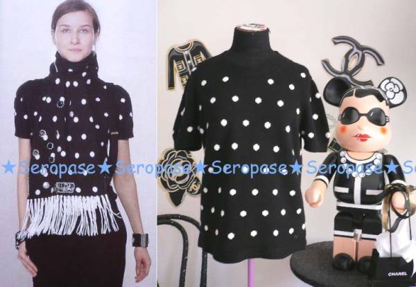 - ★08Aシャネル CHANEL 人気黒白水玉ドットカシミア半袖セーター42