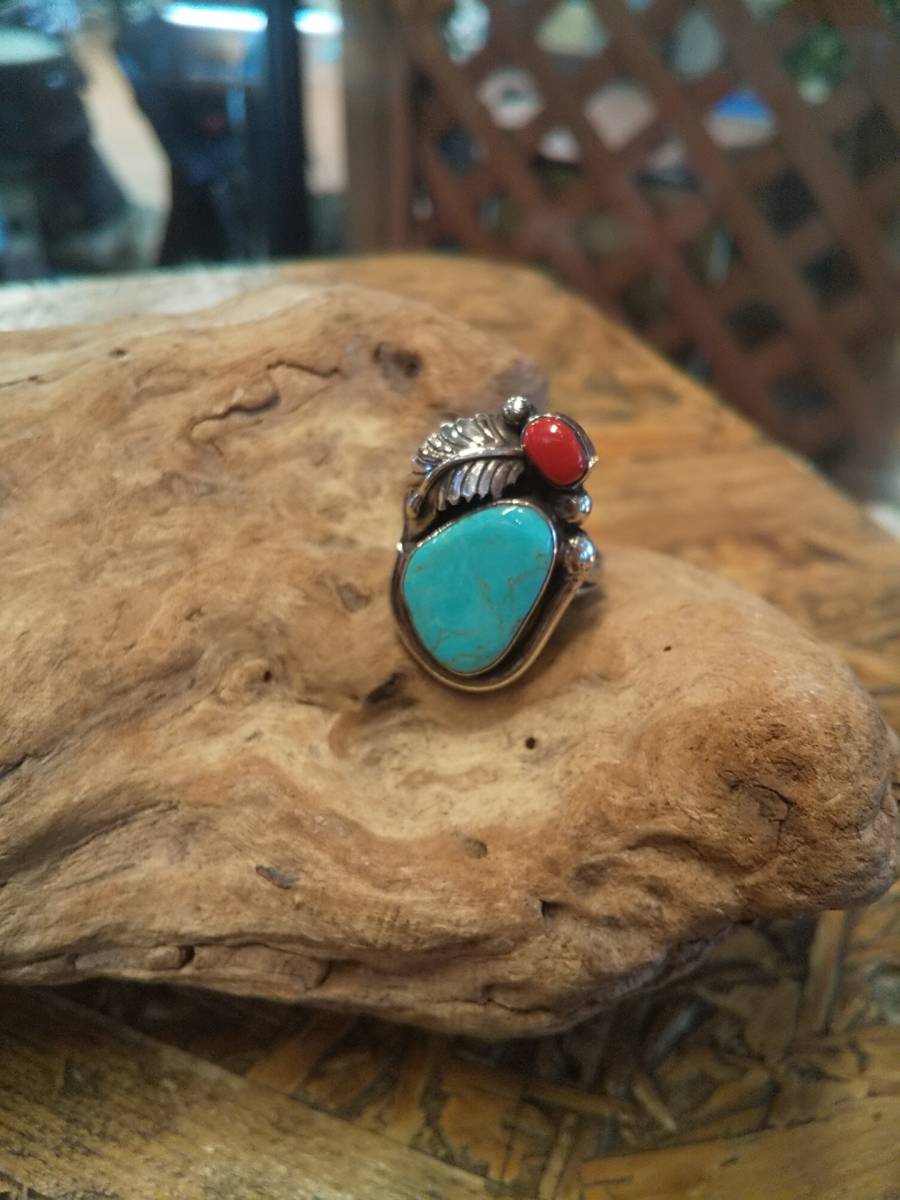 - 天然ターコイズ,珊瑚,コンビ,シルバー925,茶色,茶木目,模様,リング,指輪,19号,トルコ石,リーフ,葉,自然ナチュラル,デザイン,インディアン