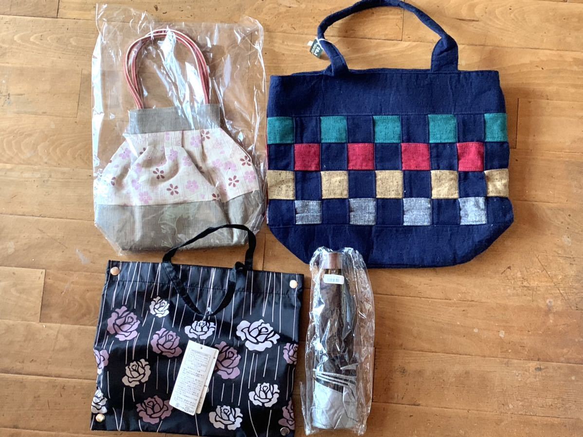 - 【お得! 昭和レトロ お得! 未使用】バッグ 3点セット 桜 バラ 和風 晴雨兼用折りたたみ傘付き 成人式にも!