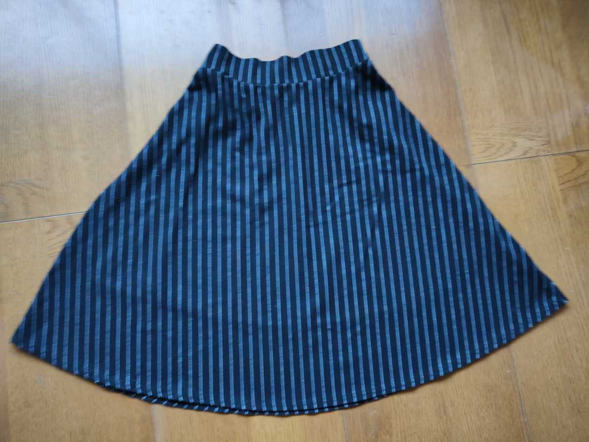 - 中古 ミモレ丈 スカート ブラック x ホワイト 黒 x 白 縦 ストライプ 裏地あり 韓国製 ポリエステル60% レーヨン 35% ポリウレタン 5%