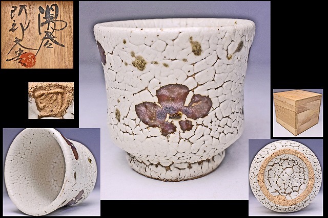 > 阿部文貴 ★ 益子焼 湯呑 ★ 共箱 ★ 糠釉 鉄絵 梅花皮 梅文 ★ 大振りで小服茶碗でも使えそうな大きさの景色豊かな逸品 ★ 食器 民芸陶 ★