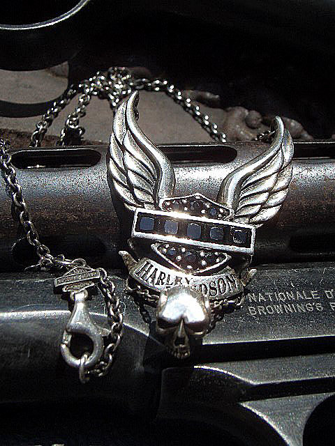 - №5† 90S HARLEY DAVIDSON Silver 925 OH♂ クール ツインウイング 天然黒石 揺れる骸骨 スカル 髑髏 ハーレーダビッドソン シルバー 新品