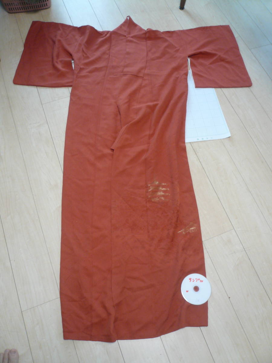 - E即決 KIMONO 着物 すそ模様 あわせ 正絹? 五七桐紋刺繍 金糸刺繍社殿 レンガ色エビチャ 和柄古典 レトロクラシック着物和装 送料600円