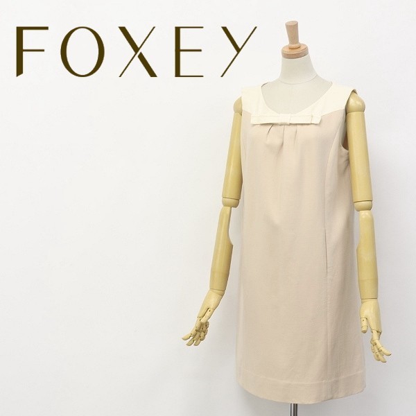- ◆FOXEY/フォクシー ストレッチ リボン ギャザー 切替 ノースリーブ ワンピース ベージュ×アイボリー 40
