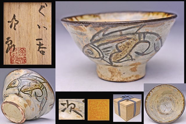 - 金城次郎 ★ 壺屋焼 ぐい呑 ★ 共箱 共布 ★ 人間国宝 ★ 双魚文 ★ 大振りで存在感のある上作 ★ 壺屋3人男 ★ 新垣栄三郎 小橋川仁王★1