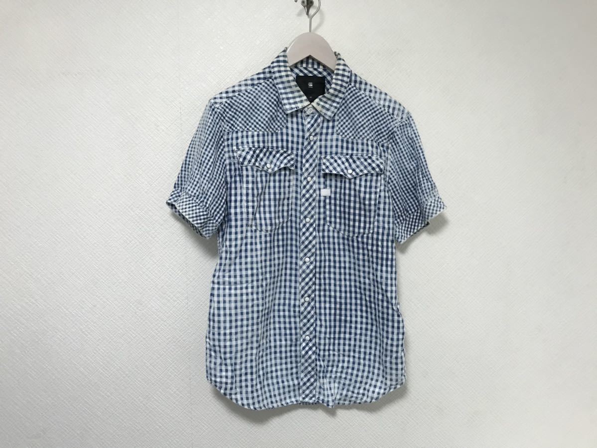 > 本物ジースターロウGSTARコットンガーゼチェック柄半袖シャツメンズミリタリービジネススーツアメカジサーフ青ブルーM