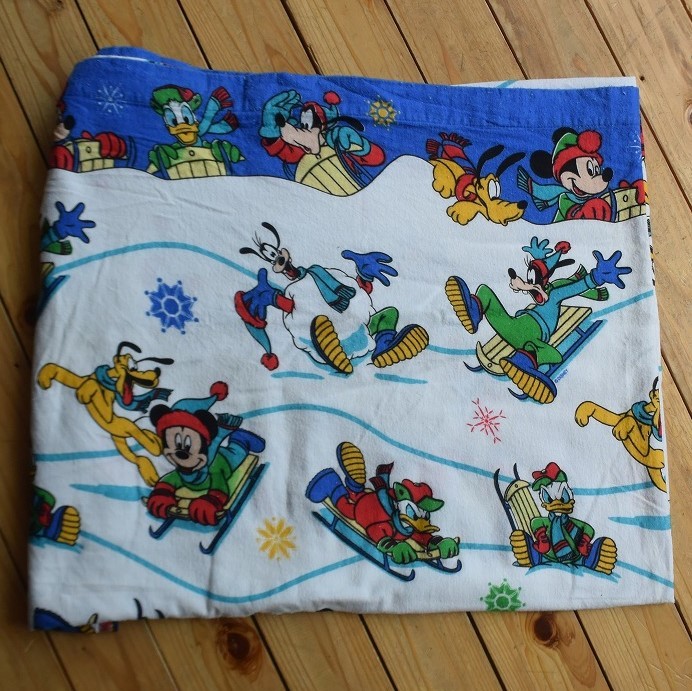 - USAヴィンテージ ベッドシーツ ディズニー リメイク生地 フラットシーツ コットン素材 キャラ スキーミッキー アメリカ仕入 総柄 B1265