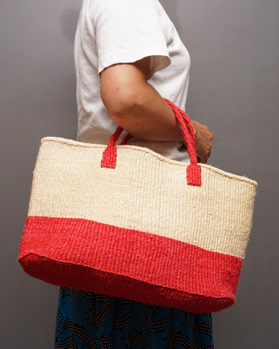 - サイザルバッグ ツートンカラー ワイド Lサイズ (ホワイト,レッド) かごバッグ アフリカンバッグ