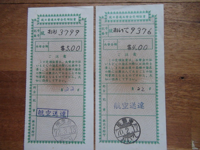 - 沖縄 復帰前 琉日普通券替金受領収書 2枚